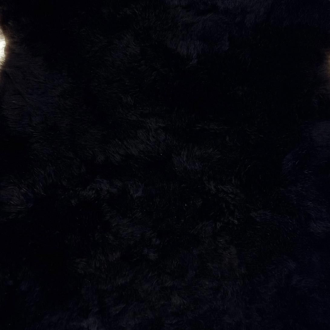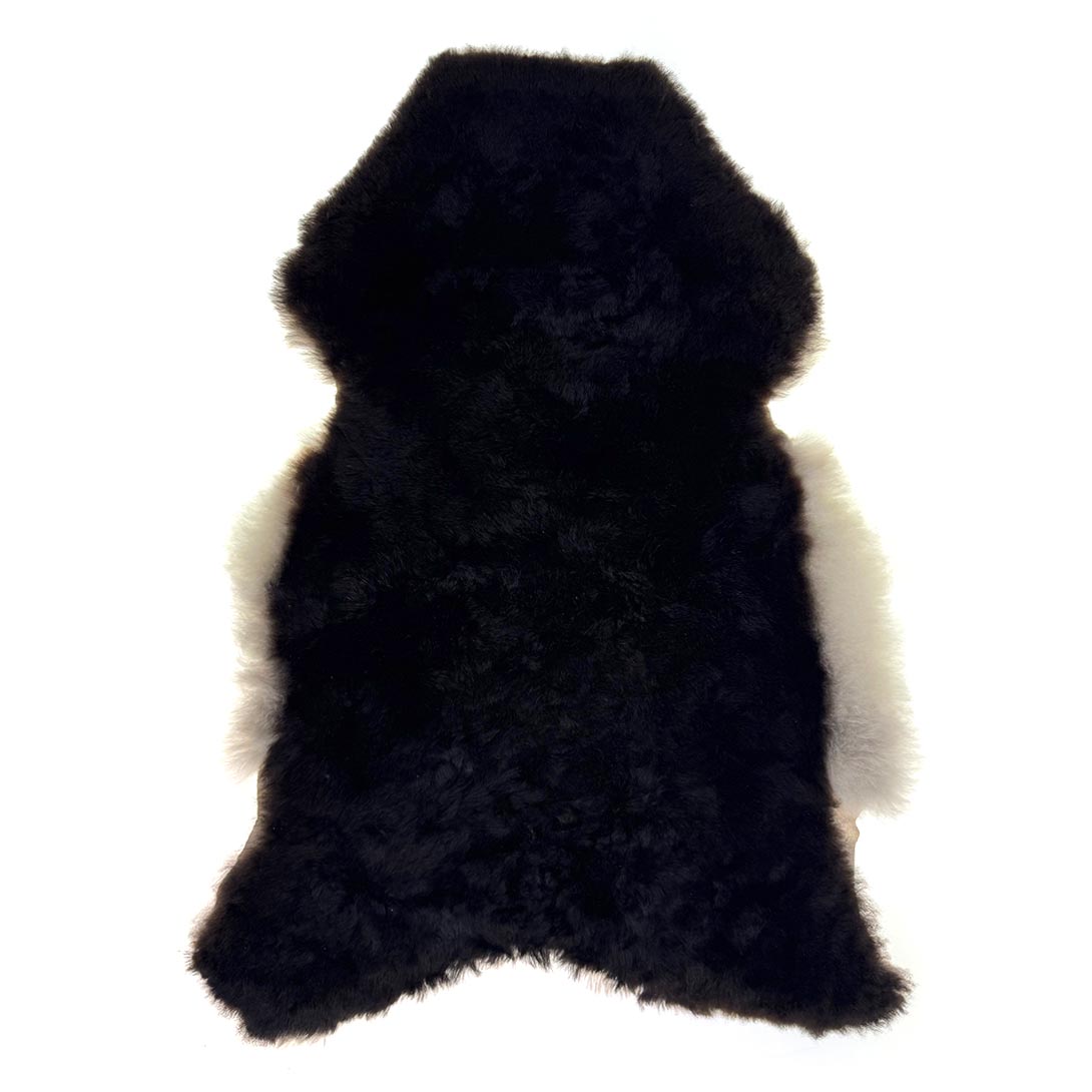 Ett eko-garvat svart korthårigt fårskinn från isländskt får, med naturliga vita kanter och en himmelskt mjuk ull.